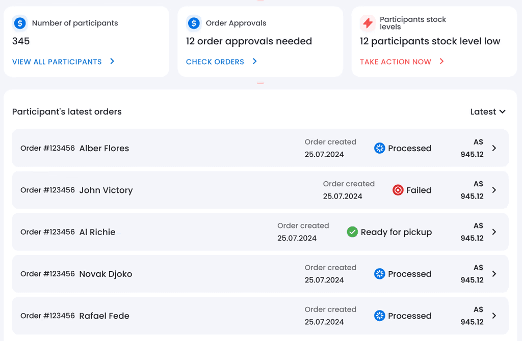 Stay updated with instant alerts when participants place orders or when stock levels are running low. Never miss an important update, helping you stay proactive.